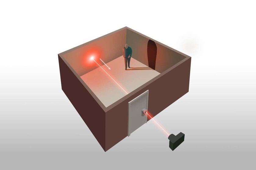 Esencialmente el sistema con la cámara fuera de la habitación apunta una luz láser por un pequeño agujero. Dependiendo de cómo rebote esa luz, la cámara puede detectar qué objetos hay ahí dentro. Si un objeto oculto dentro de esa habitación se mueve durante el tiempo de captura de imágenes, la tecnología puede capturar proyecciones de la forma del objeto oculto.